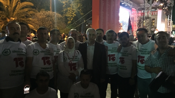Programın devamında, dernek merkezimizden hep birlikte yürüyerek saat 20.00’de Eyüp Sultan Meydanı’nda başlayan anma programına katıldık. Hazırladığımız özel tişörtlerimizle etkinlikte yer alarak, şehitlerimize olan vefa ve minnetimizi bir kez daha ortaya koyduk.
